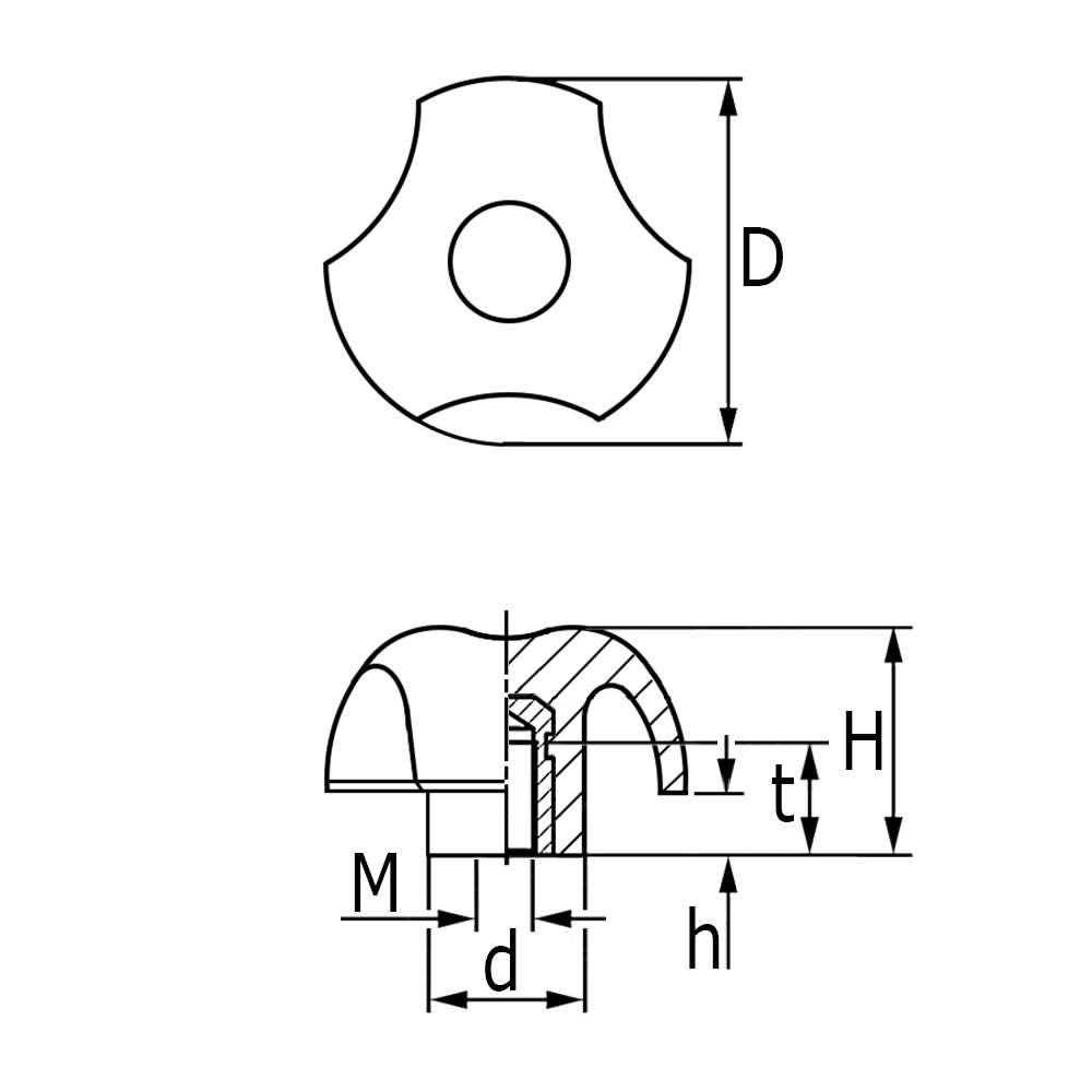 D=knob Ø, d=hub Ø, H=height, h = height, M=thread size, t=length of threaded insert