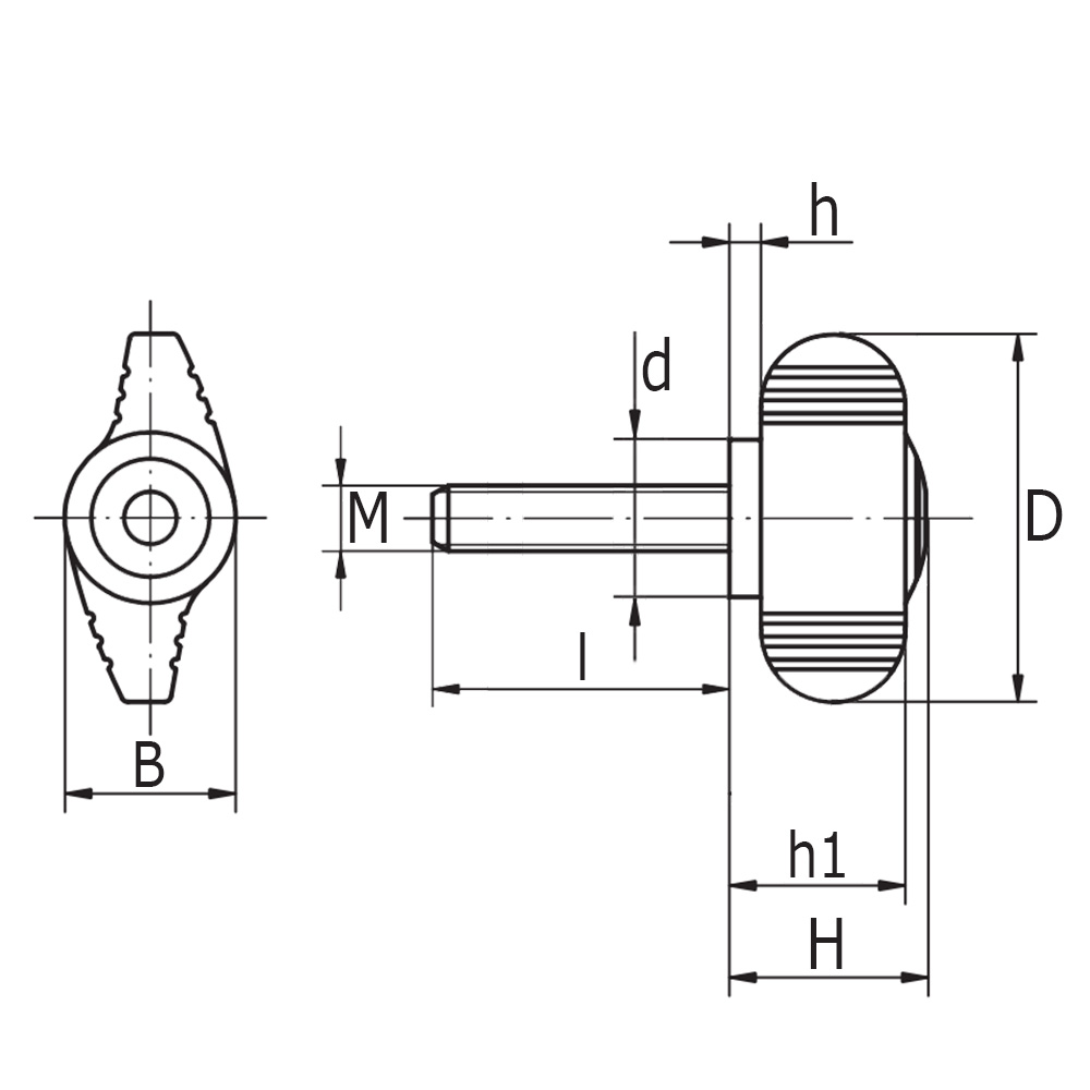 D=wing length, d=shoulder Ø, H=height, h=collar height, l=thread length, M=thread size
