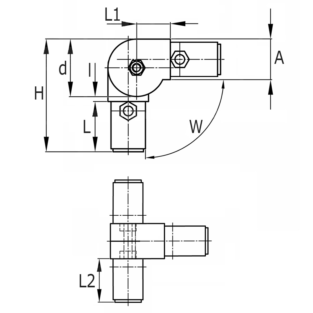 - Suitable as a corner connection with a (lockable) variable angle for square tubes made from aluminium, steel or stainless steel