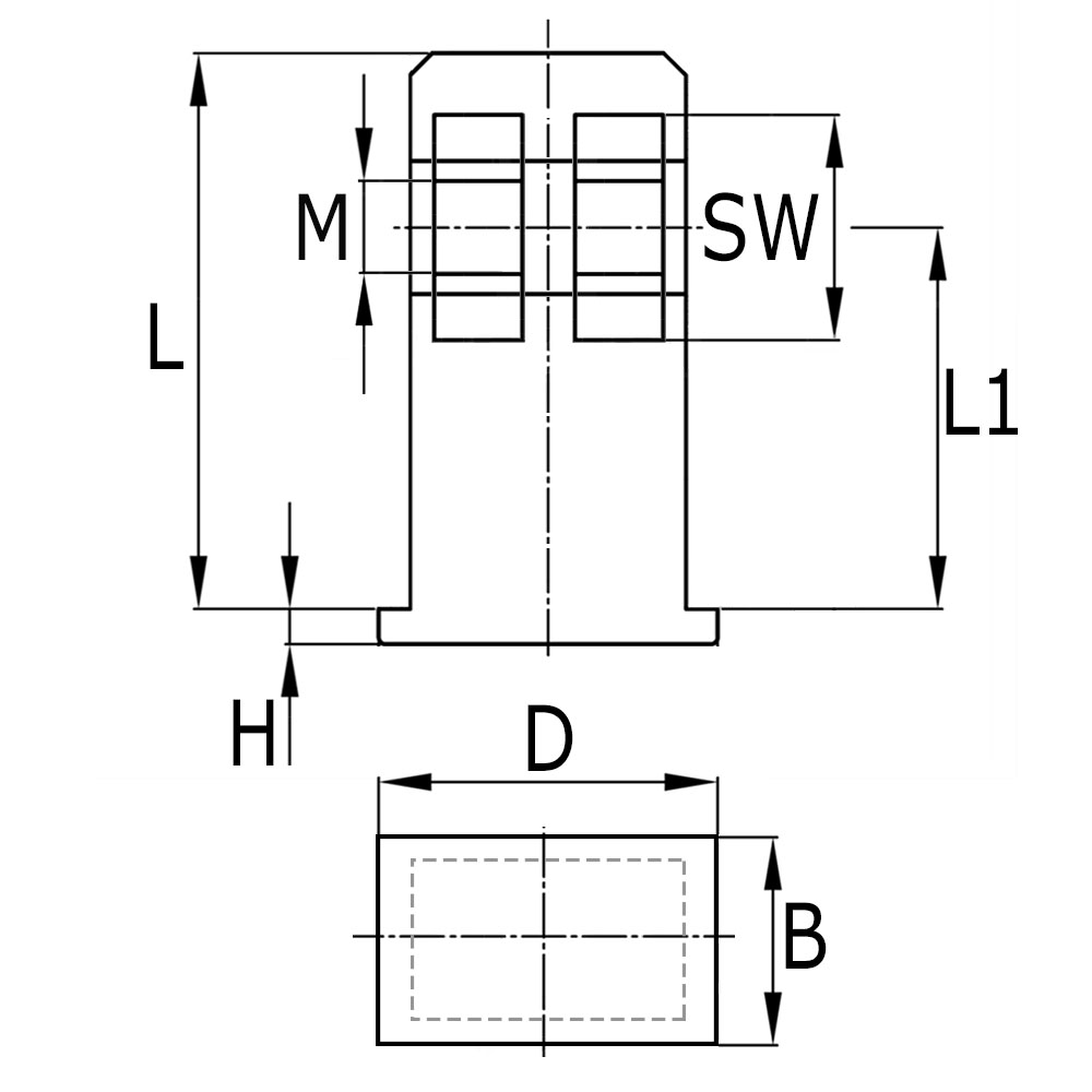 LegendH=head thickness, L1=length to nut centre, M=thread size, Model=wall thickness, SW=spanner size, Tube size=external tube dimensions, Type =1 or 2 separately inserted nuts
