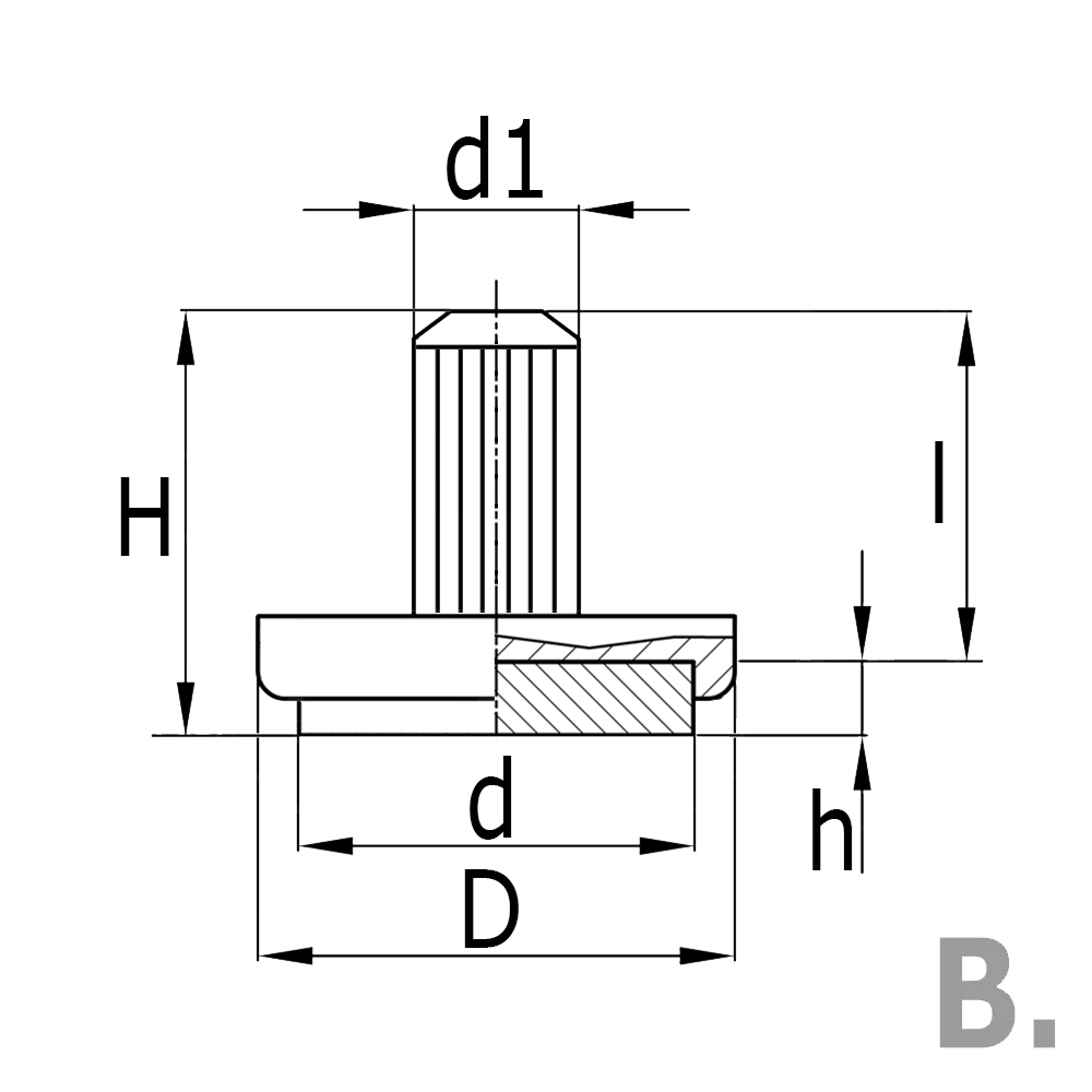 D=Ø-foot, d=Ø-felt, d1=Ø-pin, H=Overall height, h=thickness felt, l=pin-length