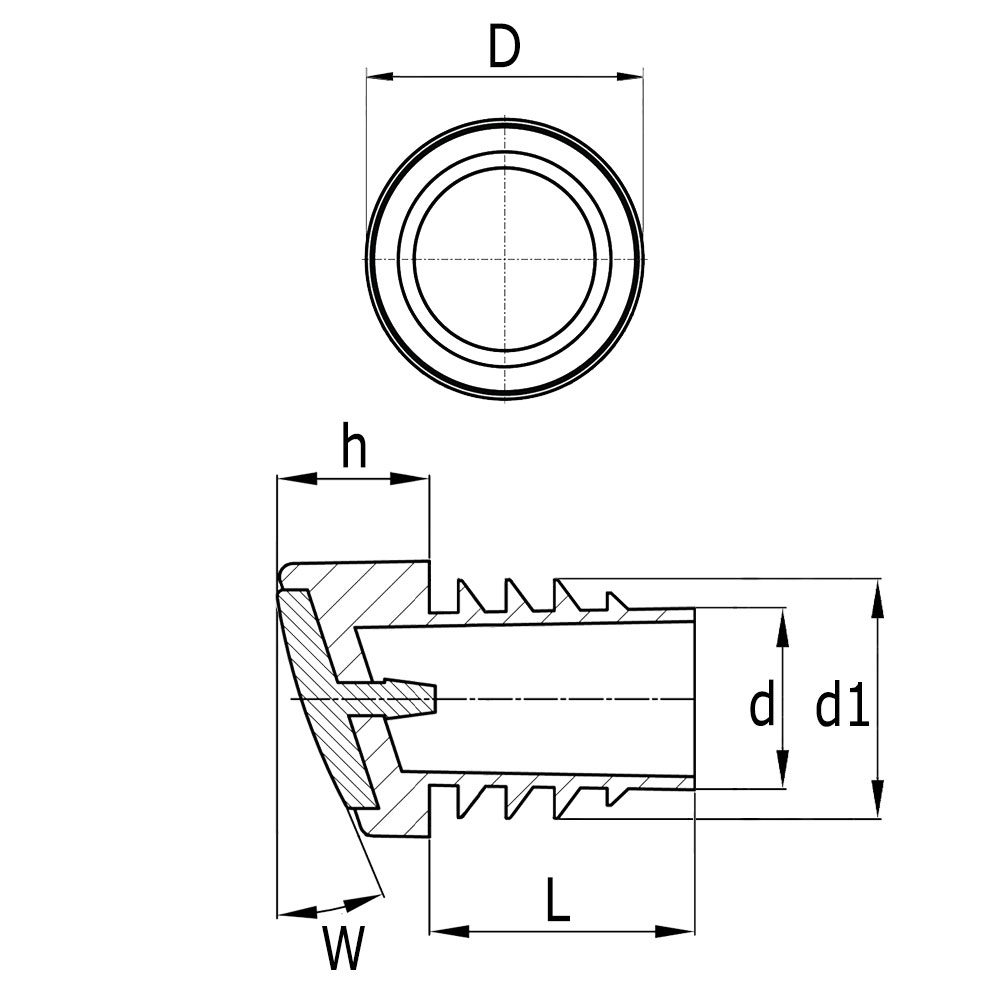 D=foot Ø, d=shaft Ø, d1=ribbing size, h=foot height, L=shaft length, Tube size=external tube dimension, Version=tube wall thickness, W=angle of inclination in °