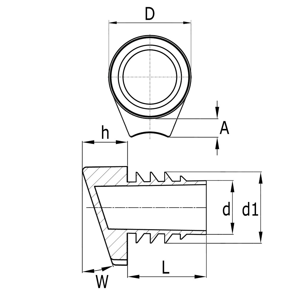 A=distance, D=foot Ø, d=shaft Ø, d1=ribbing size, h=foot height, L=shaft length, Version=tube wall thickness, Tube size=external tube dimension, W=angle of inclination in °