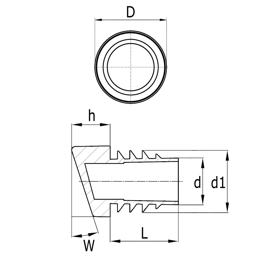 D=foot Ø, d=shaft Ø, d1=ribbing size, h=foot height, L=shaft length, Version=tube wall thickness, Tube size=external tube dimension, W=angle of inclination in °