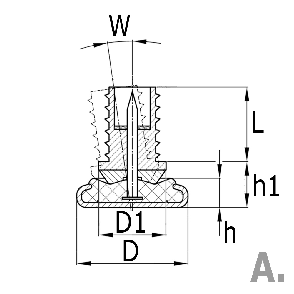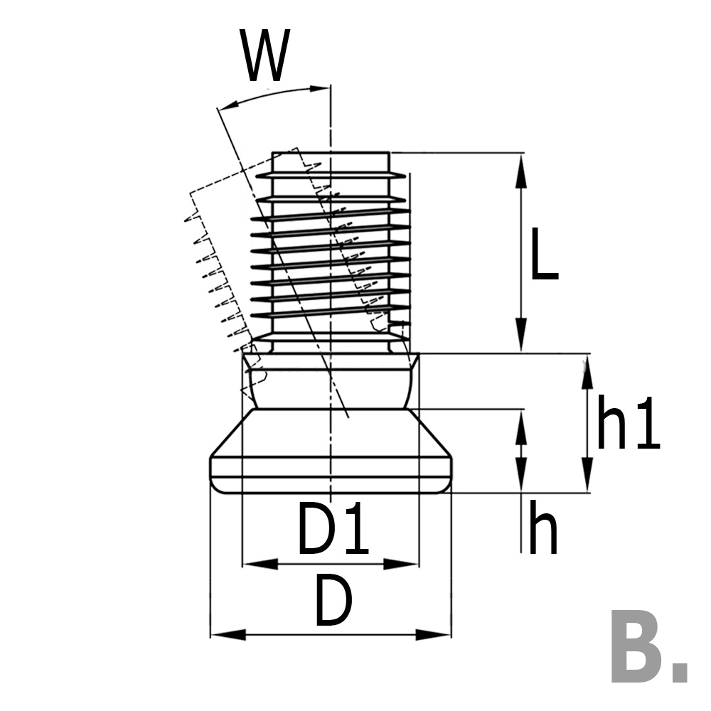 D=foot Ø, D1=collar Ø, h=foot height, h1=ball joint + foot, L=shaft length, Version=tube wall thickness, Version=Type of joint, Tube size=external tube dimension, W=angle of inclination in °
