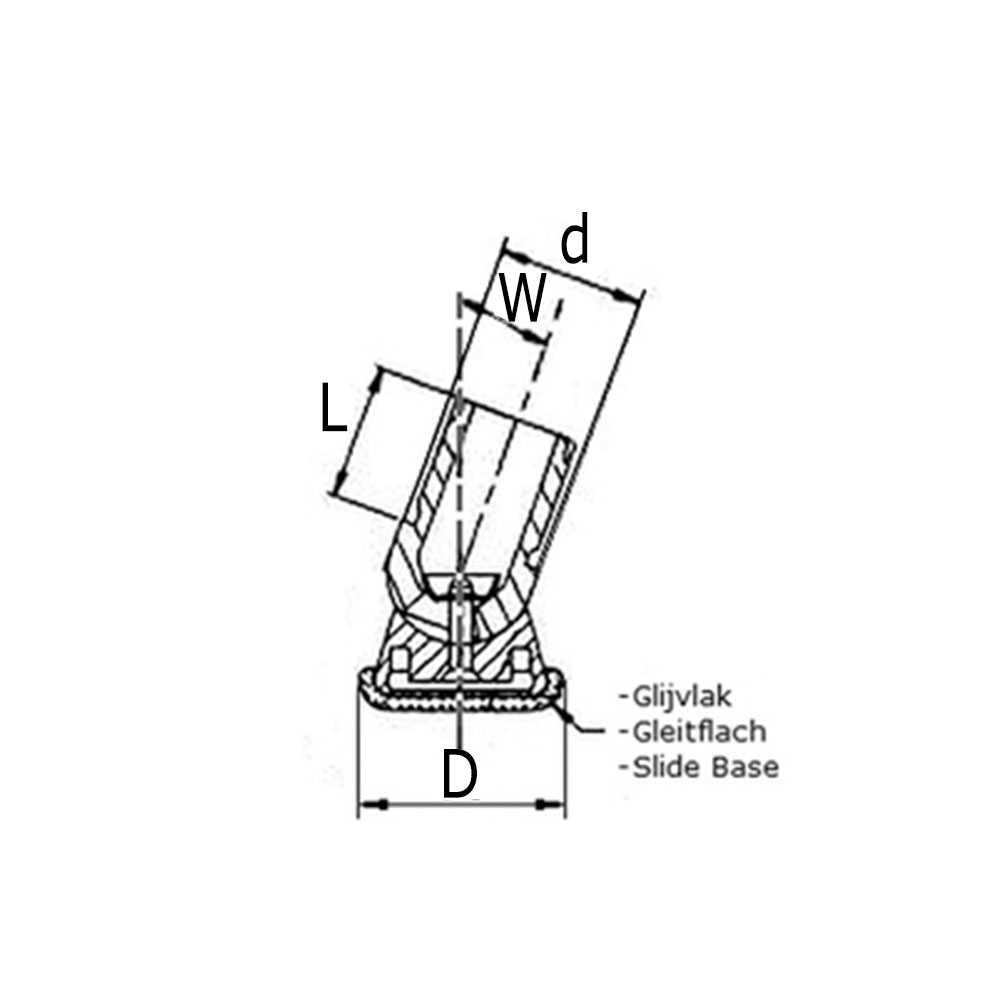D=foot Ø, d=collar-Ø, L=shaft length, Tube size=external tube dimension, Version=tube wall thickness, W=angle of inclination in °