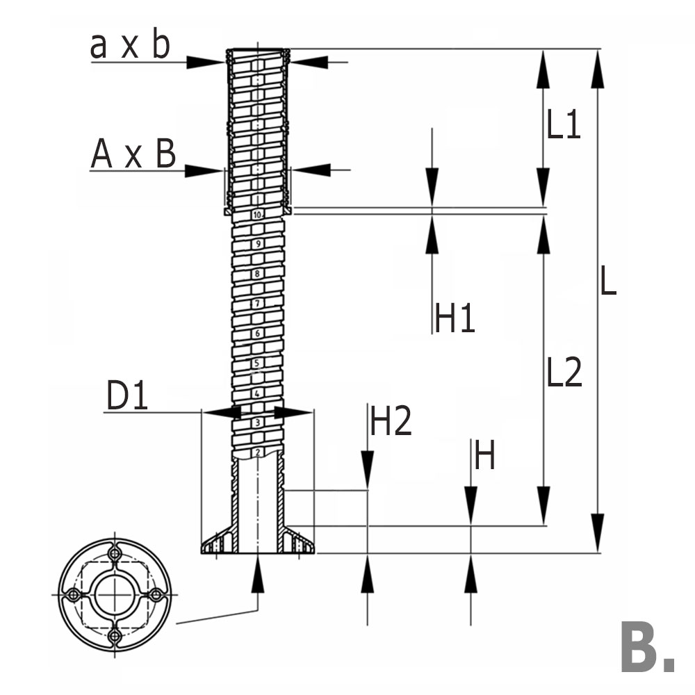 A x B=shoulder sizes, a x b=ribbing sizes, D1=foot Ø, H=foot height, H1=shoulder thickness, H2=minimum height with stem fully screwed in, L=total length, L1=shaft length, L2=adjustment range, Model=wall thickness, Tube size=external tube dimension
