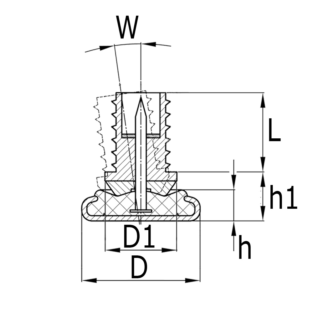 LegendD=foot Ø, D1=collar size, h=foot height, h1=ball joint + foot, L=shaft length, Tube size=external tube dimension, Version=tube wall thickness, W=angle of inclination in °