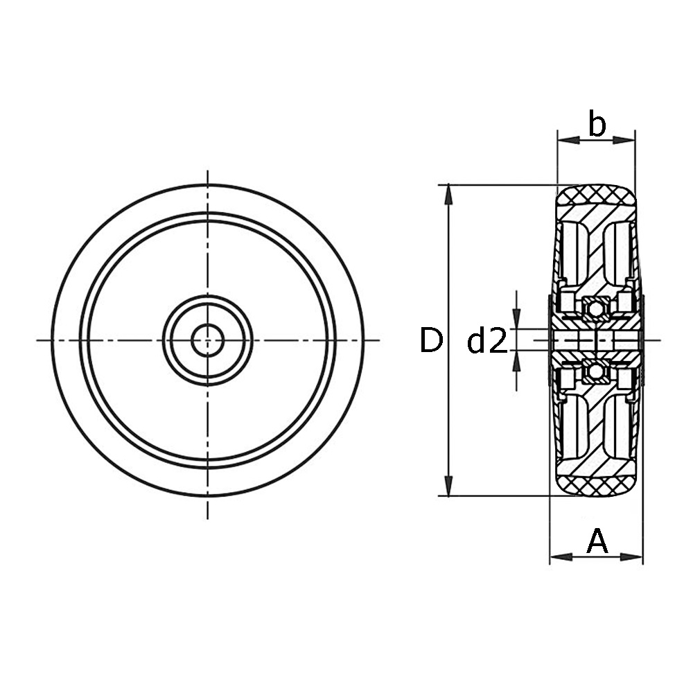 A=hub width, b=tread width, D=Øwheel, d2=Ø-shaft bore, K=maximum static load capacity in kg