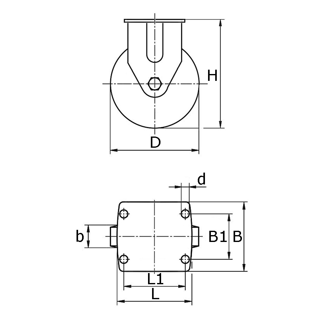 B=mounting plate width, b=tread width, B1=dimension between hole centres, D=wheel Ø, d=hole Ø, H=total height, K=maximum static load capacity in kg, L=mounting plate length, L1=dimension between hole centres, Type=type of wheel bearing