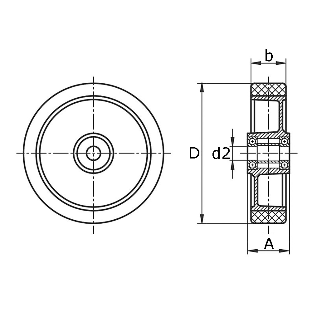 A=hub width, b=tread width, D=Øwheel, d2=Ø-shaft bore, K=maximum static load capacity in kg, Type=bearing type