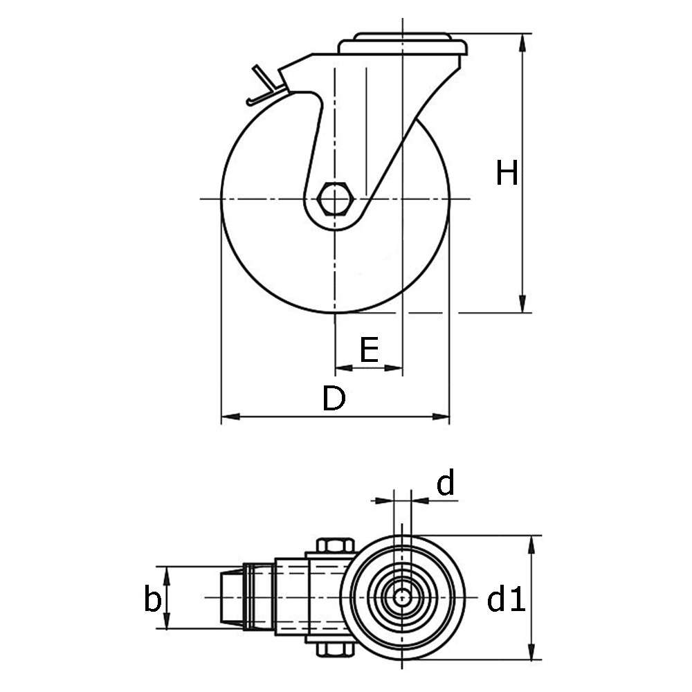 b=tread width, D=wheel Ø, d=hole Ø, E=offset, H=total height, K= maximum static load capacity in kg, Type=type of wheel bearing