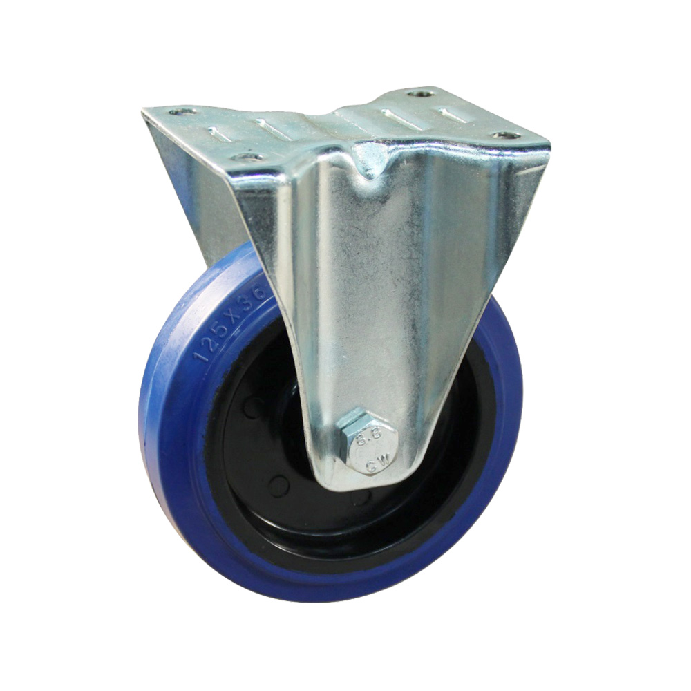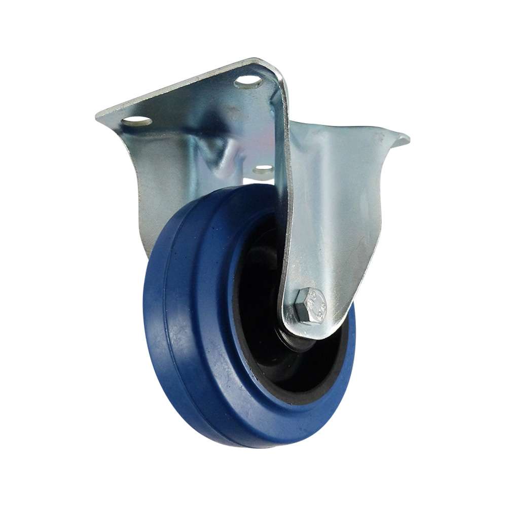Fixed castor 125mm blue elastic rubber tyre - mounting plate