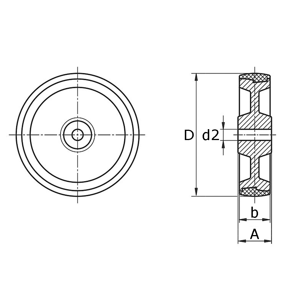 A=hub width, b=tread width, D=wheel Ø, d2=Ø-shaft bore, K= maximum static load capacity in kg, Type=type of wheel bearing