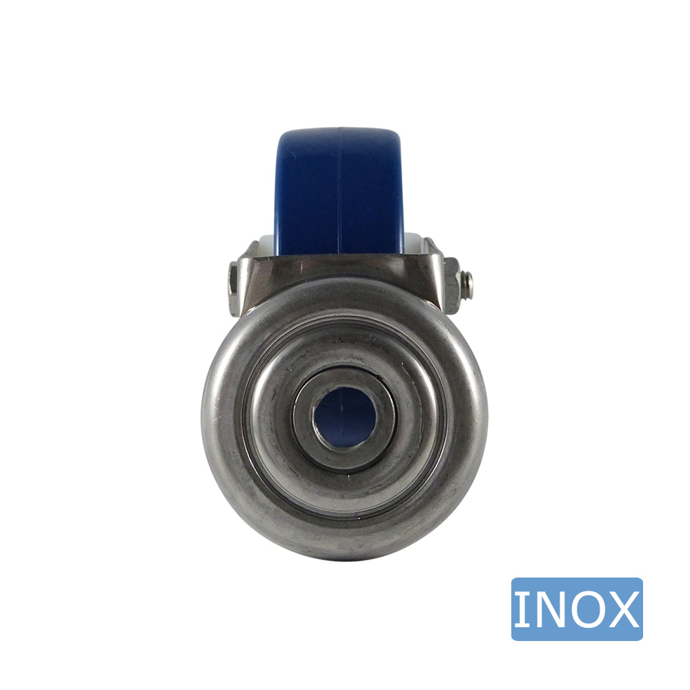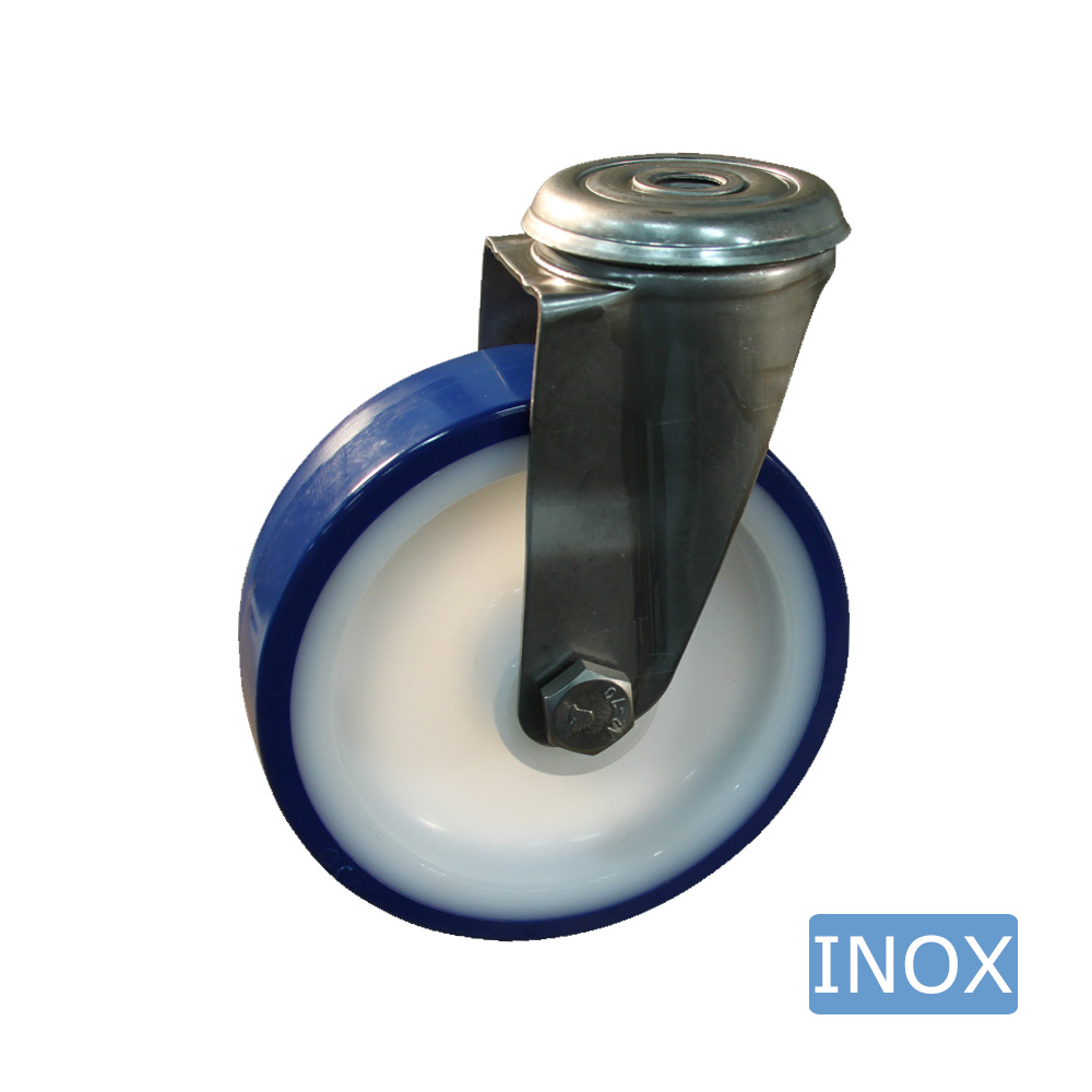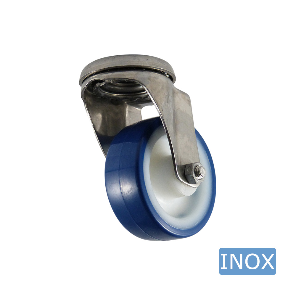- Hygienic stainless steel swivel castors with a blue tyre are available in wheel sizes from Ø80mm to Ø150mm inclusive