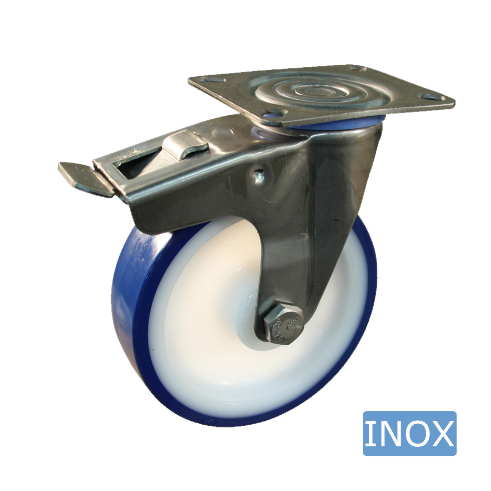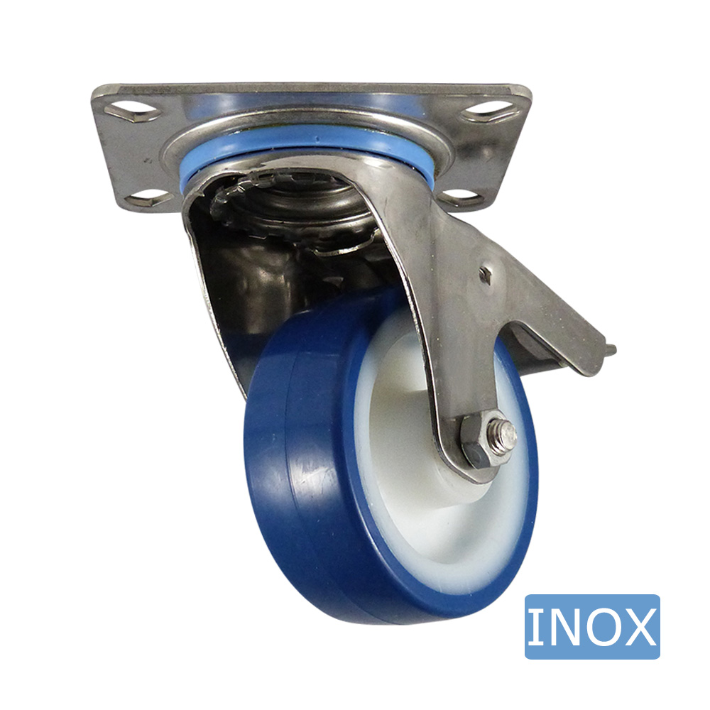 - Hygienic stainless steel swivel castors with a brake and a sapphire blue tyre are available in wheel sizes from Ø80mm to Ø150mm inclusive