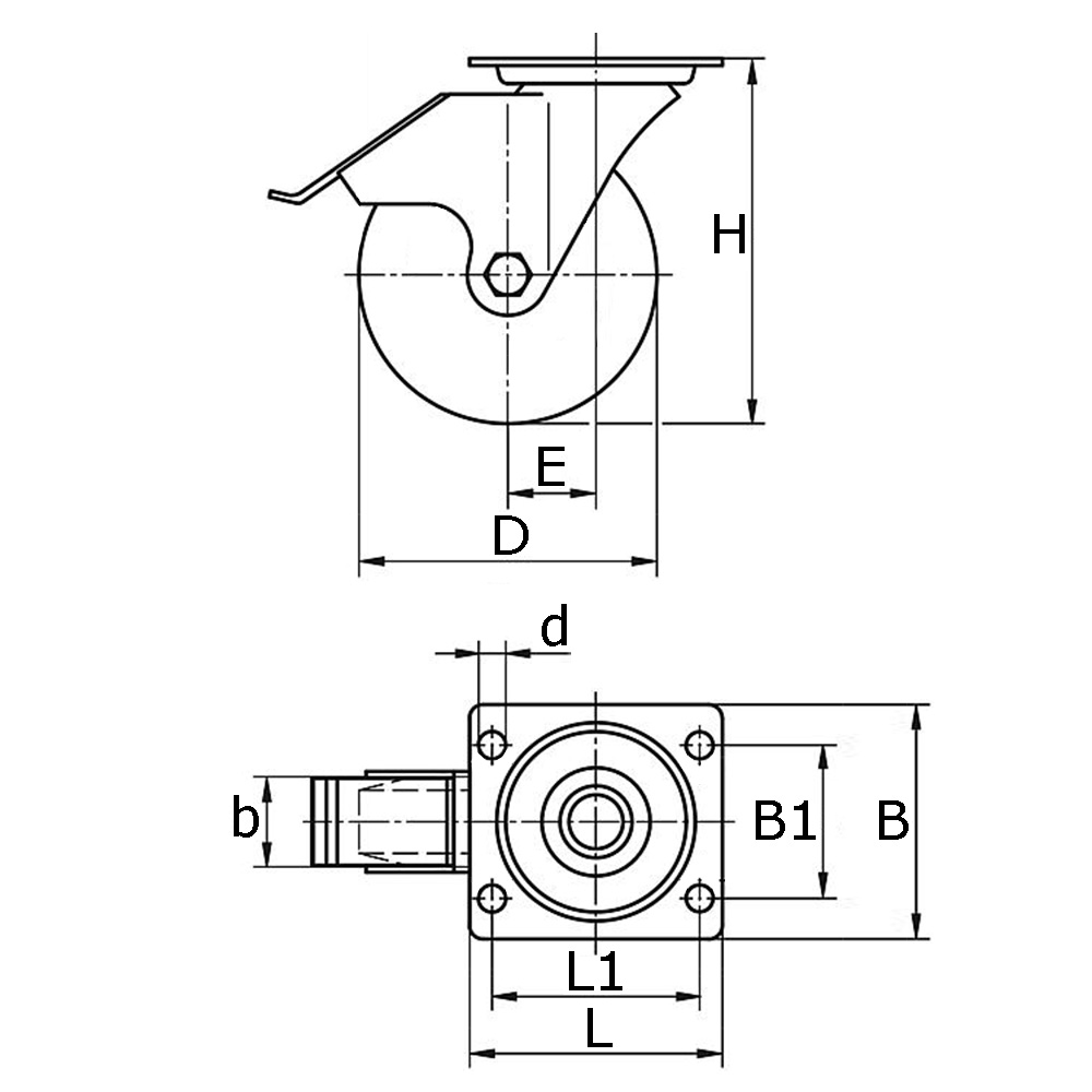 B=mounting plate width, b=tread width, B1=dimension between hole centres, D=wheel Ø, d=hole Ø, E=offset, H=total height, K=maximum static load capacity in kg, L=mounting plate length, L1=dimension between hole centres, Type=type of wheel bearing