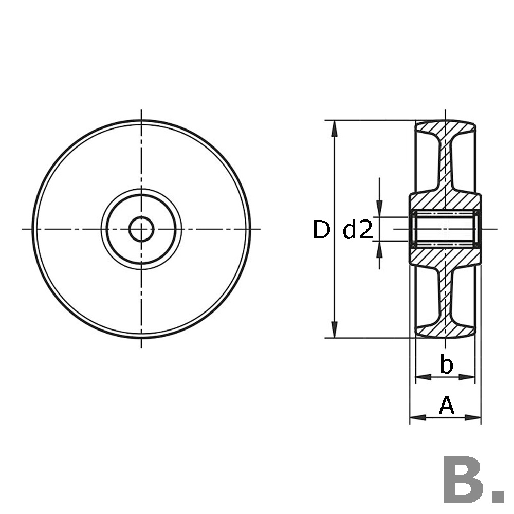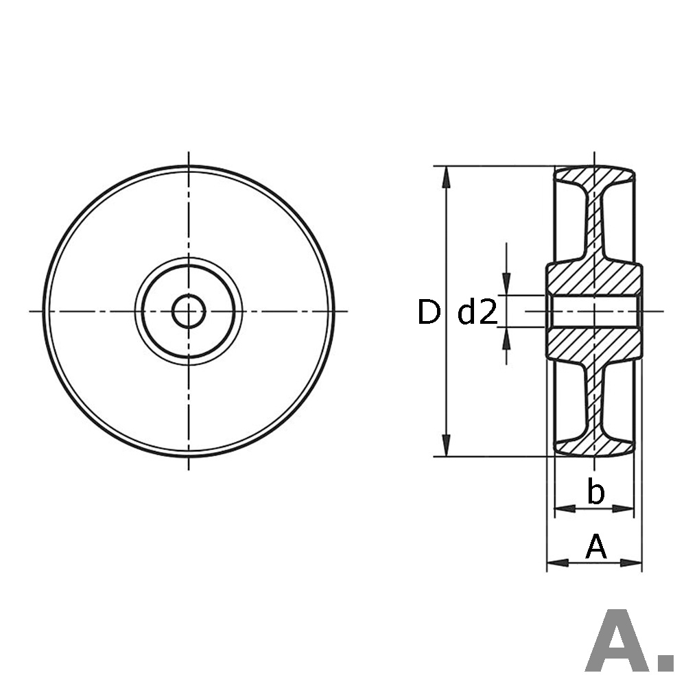 A=hub width, b=tread width, D=Øwheel, d2=Ø-shaft bore, K=maximum static load capacity in kg