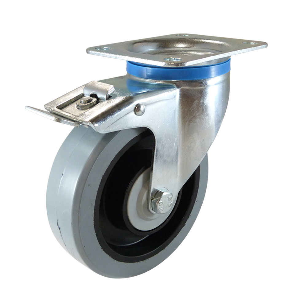 Swivel castor with brake - mounting plate - elastic rubber tyre on plastic rim
