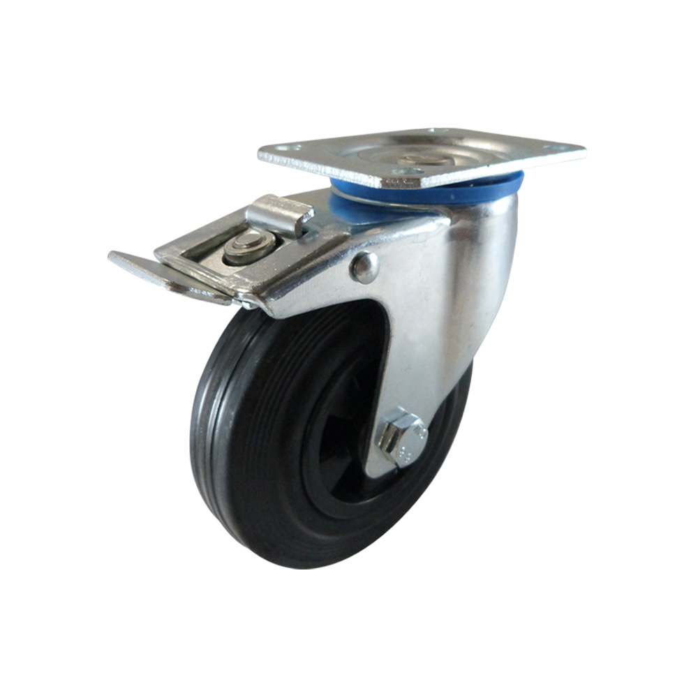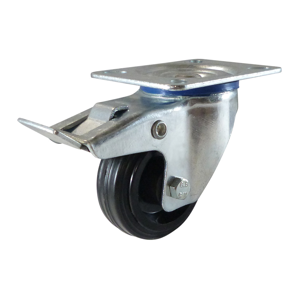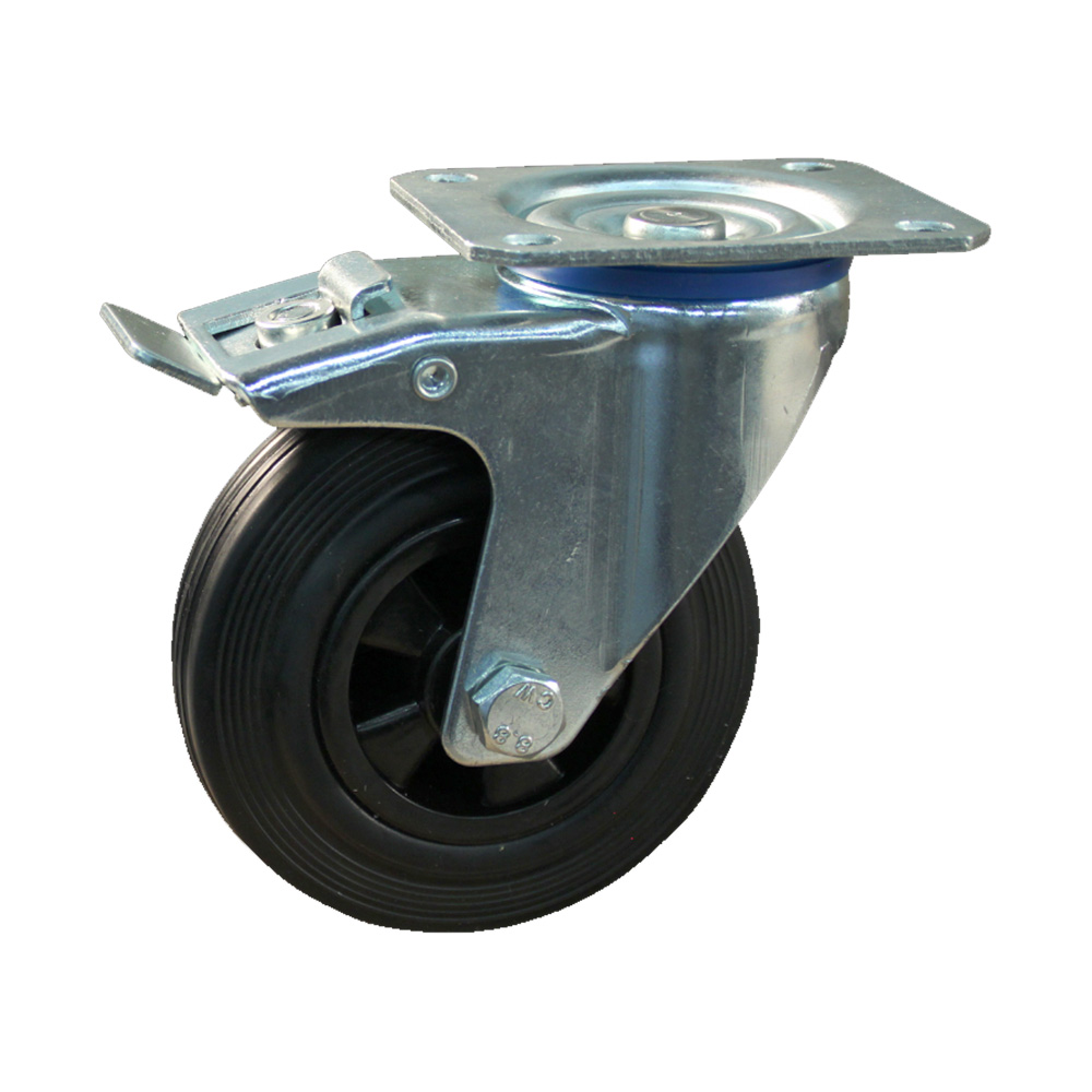 - Swivel castors with a brake, mounting plate, plastic rim and standard solid rubber tyre are available in wheel diameters from Ø80mm to Ø250mm inclusive