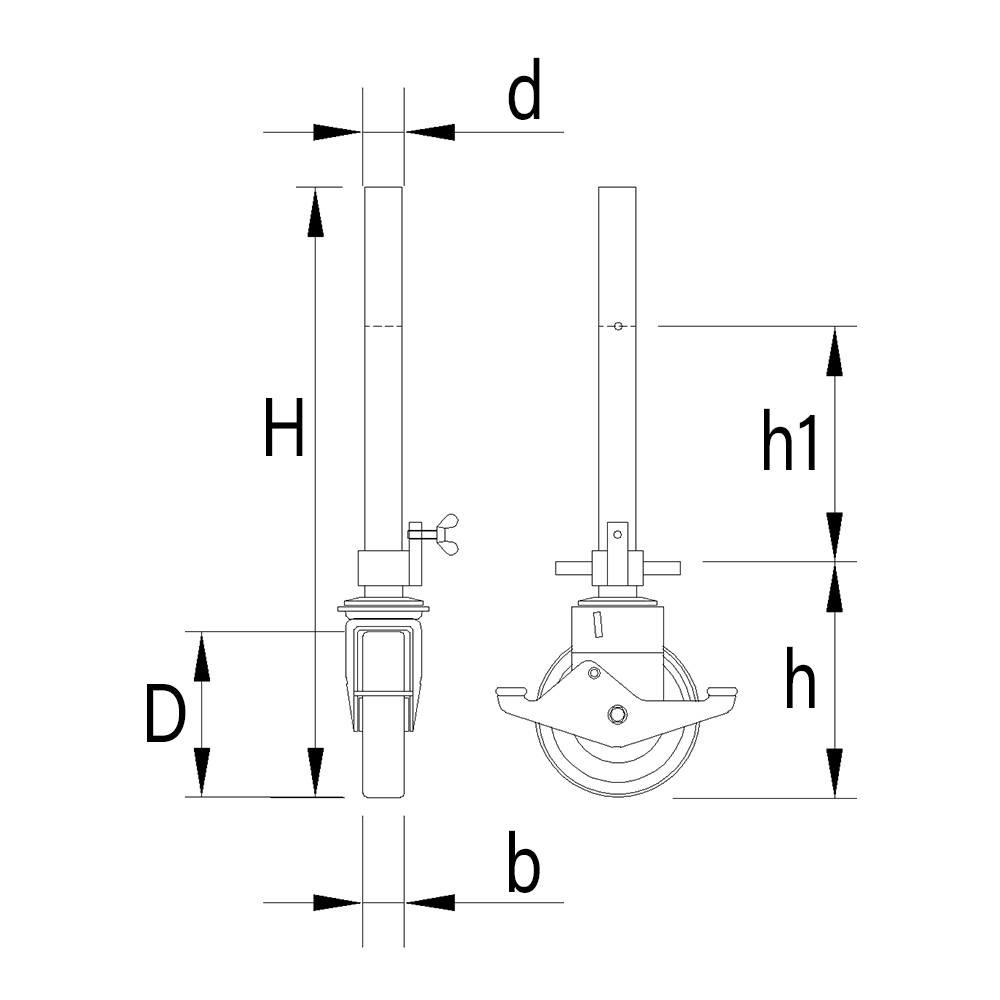 Tube size=Suitable for scaffolding tube Ø (external), b=Wheel tread width, D=Wheel Ø, d=Threaded spindle Ø, H=Total height, h=Height, h1=Height, K=Max. load capacity in kg, Version=Wheel type